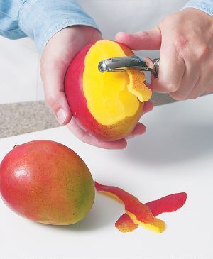 Peel a mango and chop the skin up into pieces then either sun-dry or oven-bake them to make crunchy chips. Invert the Peel and Cut. Place the blade of the peeler against the mango skin and wiggle it back and forth to break the skin and then pull to peel the skin.