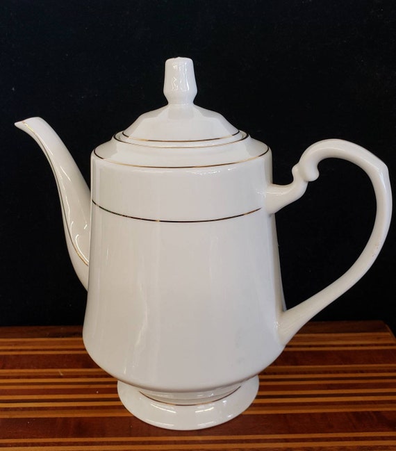 This pattern features a simple all white design with thin gold band detail. 5 out of 5 stars 383 1237. Royal Majestic Fine China DOr 8404 Gold Trim Tea Pot ServingUpVintage.